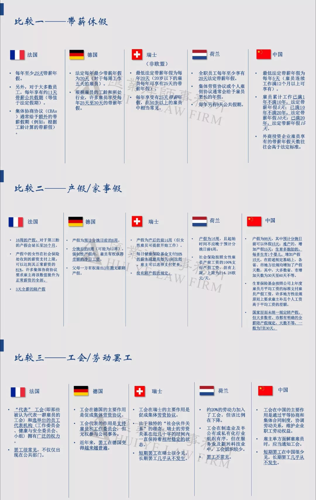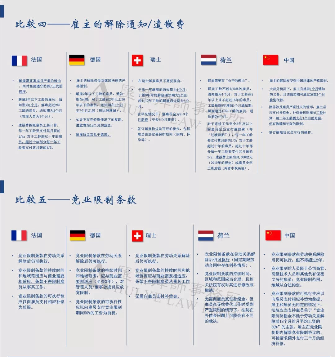 本文着眼于四个主要欧洲国家——法国、德国、瑞士和荷兰,并同时参照中国的劳动法框架,在以下几个方面通过言简意赅的概括式描述提供对比概览: