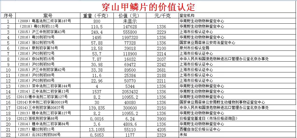 笔者为确定穿山甲鳞片的价值认定标准,检索了近10年来自若干地区法院根据旧规定作出的判决,关于价值认定的具体信息如下表:
