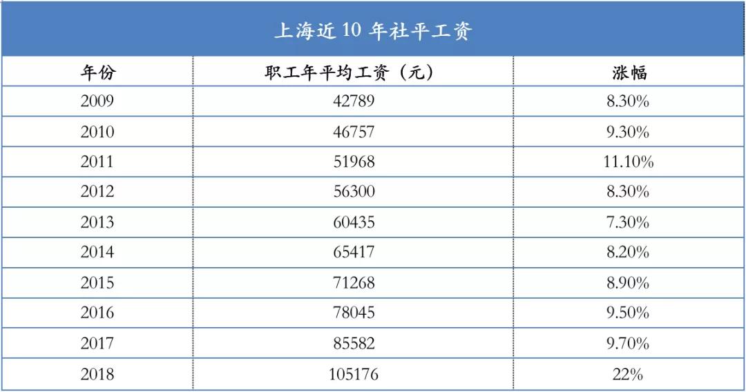 社保缴费基数为上一年度社平工资,上限为300%,下限为60%。近10年上海社平工资和涨幅如下表: