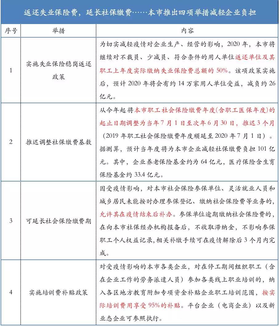 2020年2月3日本是“开工大吉”的日子,但是新型冠状病毒肺炎的病例不断飙升,防控疫情仍然是全民的首要任务。上海市人力资源和社会保障局会同市医保局、市财政局等相关部门共同研究出台了本市企业减负的相关政策,经市政府同意,出台了关于“返还失业保险,延长社保缴费……本市推出四项举措减轻企业负担”的政策,如下表: