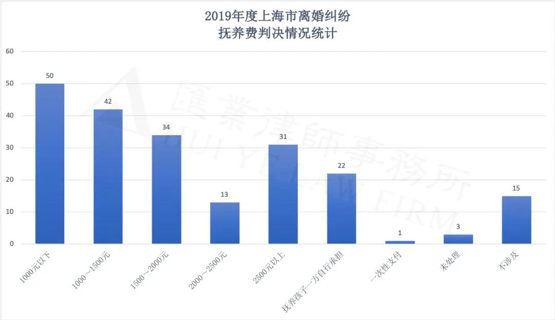 在2019年度所有判决准许离婚且涉及子女抚养的一审案例中,抚养费水平较2018年度并未有显著变化,有126例仍然较为平均地分布在数百元至2500元之间,而抚养费被判决2500元以上的为31例。