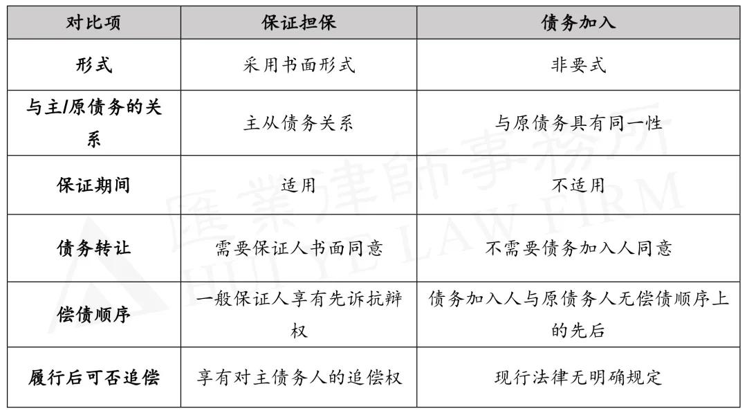 就现有的法律规定来看,债务加入相较于保证担保而言独立性更强,两者主要有以下区别: