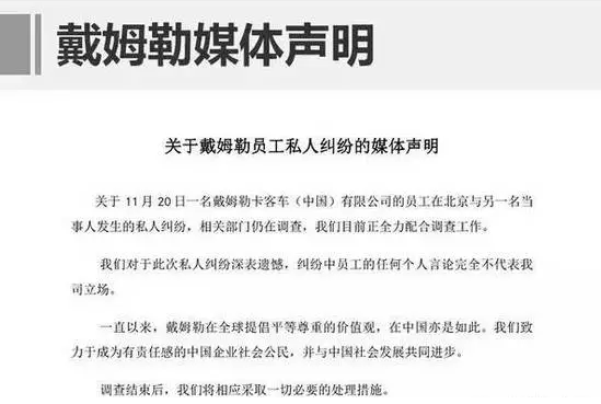日前,有网友曝料称,20日中午12点左右,北京顺义中央别墅区发生了一起外国公司驻华高管因停车口角纠纷当众辱骂中国居民的事件,该高管蔑称“中国人都是杂种养的”。21日,戴姆勒大中华区官方发表的媒体声明,声明中称“相关部门仍在调查,目前正全力配合调查工作,对于此次私人纠纷深表遗憾,纠纷中员工的任何个人言论完全不代表我司立场。”